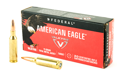 Train like never before with 224 Valkyrie and American Eagle rifle. The loads feature Federal(R) brass, clean-burning powder, consistent primers and accurate 75-grain TMJ bullets. They’re the ultimate range ammunition for the ultimate MSR 15 cartridge.