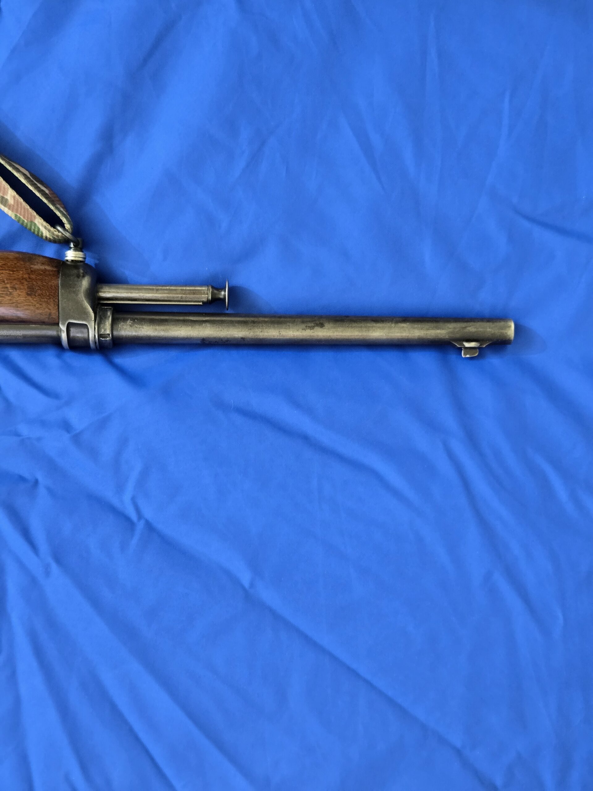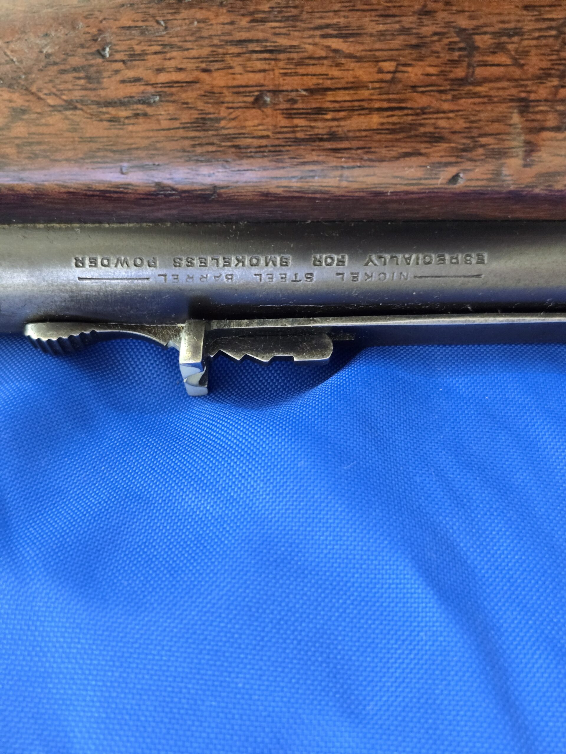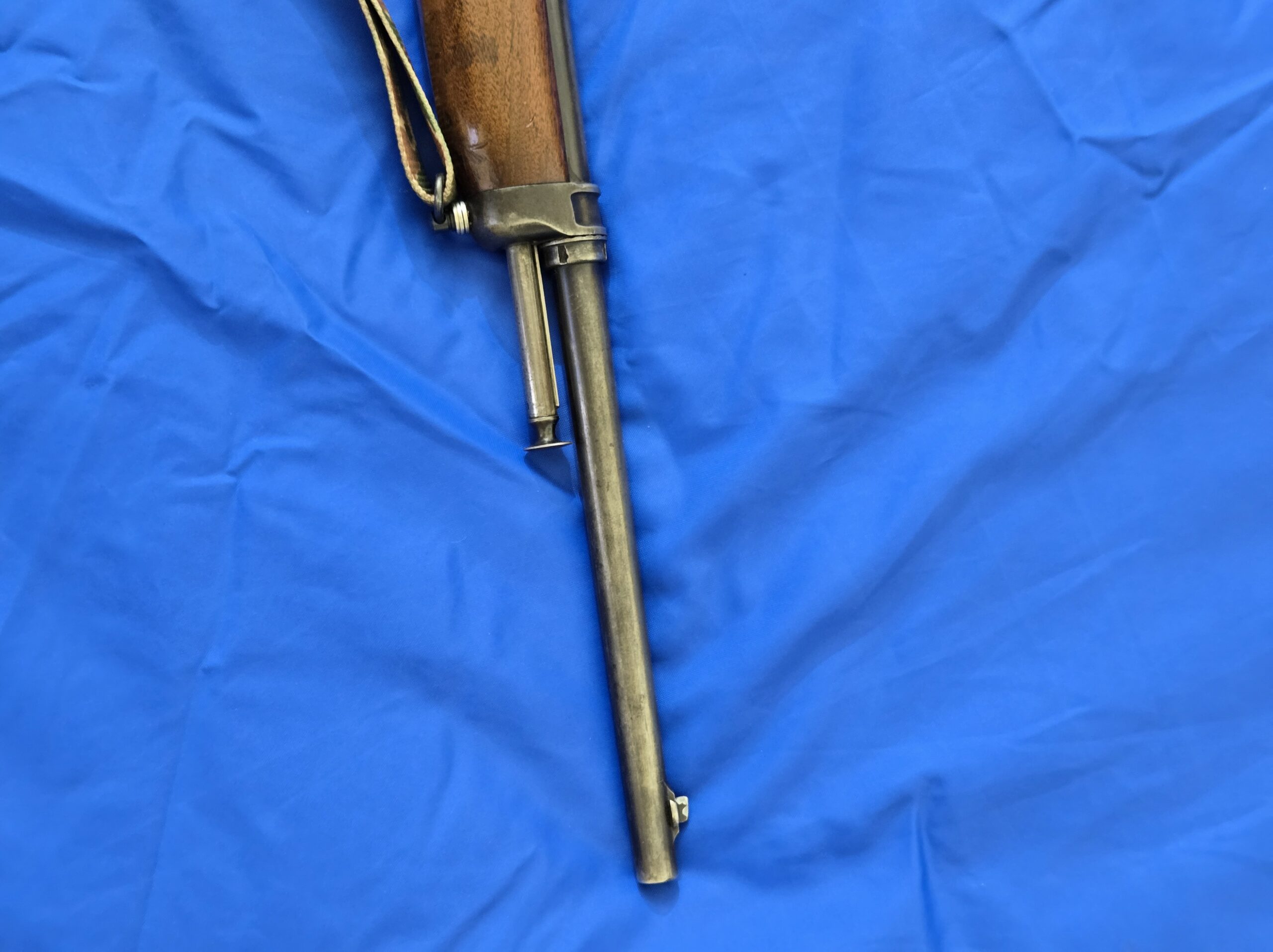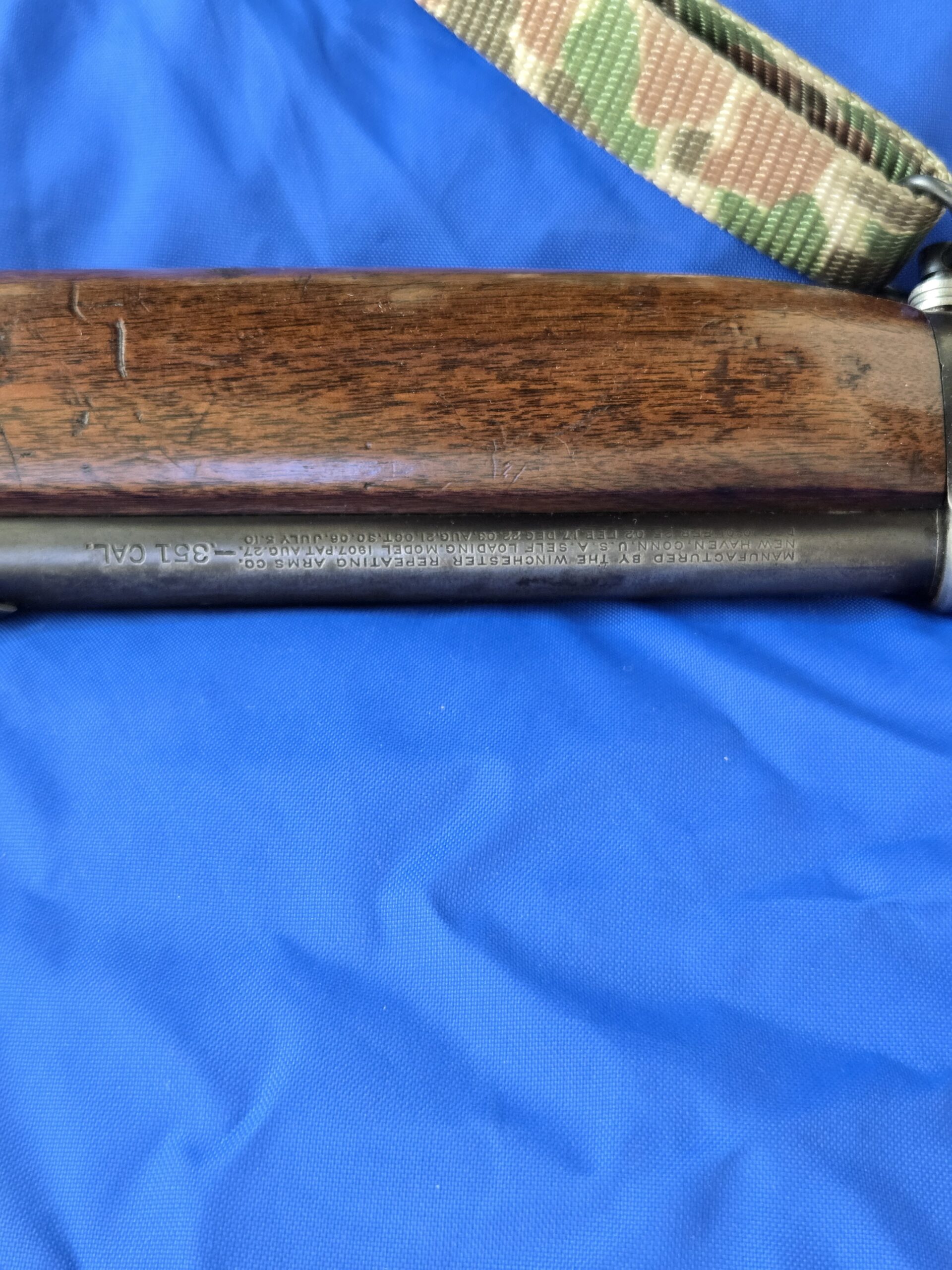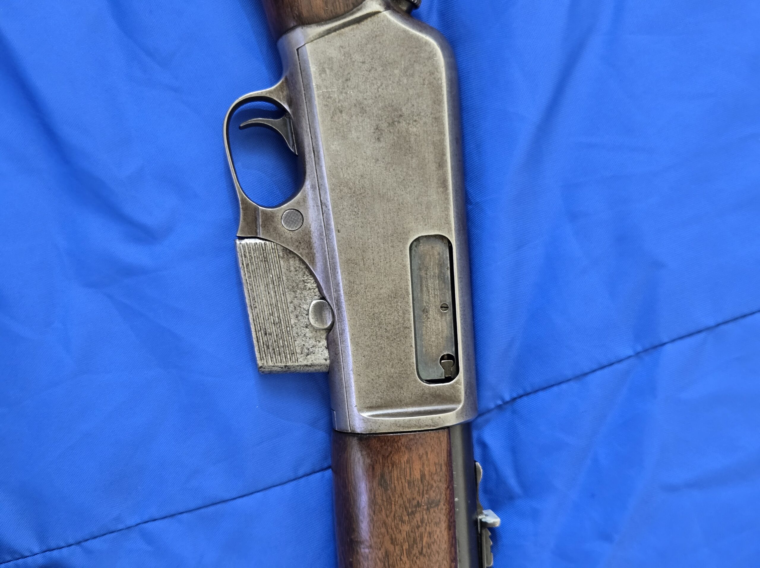 This example shows the honest patina of service and handling, with clean, solid walnut, a smooth steel receiver, and the unmistakable contours of Winchester’s early self-loading design. Mechanically, the rifle remains functional, with no cracks in the stock and the forearm retaining its original form. The recoil pad sleeve is aftermarket, removable, and common on rifles of this era.
